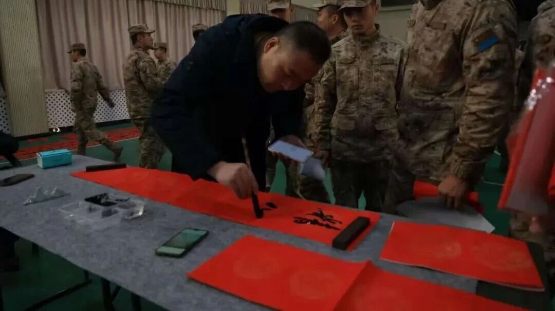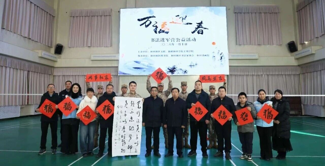 新春将至,墨香暖营。1月10日,由和田地区文联、新疆和田学院于阗学院联合主办,和田地区图书馆、和田地区书法家协会、和田书画院共同协办的“翰墨拥军·福满军营”2026年“万福迎春”文艺志愿进军营公益活动在空军某部举行。此次活动旨在通过传统文化艺术形式,向驻和官兵传递新春祝福,丰富军营文化生活,弘扬中华优秀传统文化。